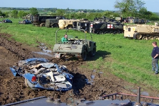 Discovery Channel We had this phone call about doing something with discovery channel it was hard to understand what they wanted but i recognised the words CAR CRUSH so i just said yes no problem. It turned out these weren't your normal Luvies, these were the arty hi brow ones making an in fill to go between all the programs on discovery for the next year or so, bit like those fools tap dancing on ally checker plate on the BBC so they wanted to start with droplets of water rolling down a highly waxed bonnet of a car with a big wobbly 7 litre engine, i should have guessed really. Luckily we keep an old full race Aston martin knocking about the farm that has just that sort of engine, then they wanted a few wheel spins and shots of the rev counter and exhaust smoke etc easy stuff really. The next shot they wanted was a flock of birds flapping away looking scared so we used sheep instead, Luckily we had Colin on site 12 years in the SAS knows all about sheep told me how he had gutted ! One once with his killing knife and hid inside its carcase for a fortnight behind enemy lines in Macclesfield. Any way we herded a massive flock together slung a bucket of food in the middle to hold them then let a thunder flash off next to them the film crew jumped out of their skin and the sheep just carried on eating .Luckily we had Colin the expert, He shouted Plan B and with a blood curdling battle cry dropped his keggs, worked a treat never seen a film crew look so scared and the sheep ran away too. Turns out SAS stands for *hag all sheep Saturdays and Sundays. The film crew had commissioned Colin earlier to manufacture a mechanical device to produce ripples on a large puddle while i drove a stalwart by it, it’s debatable whether this would have worked, luckily i ran it over and we finished the shoot slapping the water with a shovel. The final shot was of a car crush which i expected the rather glamorous camera girl to do, it being a girl thing really .But no they wanted me to do it .Funny thing is we crush hundreds of cars here but its very rare i do it .Anyway with a bit of luck yours truly will have his toothy grin between every program on discovery for the next 6 months Fame at last, Parkinson next i bet. |