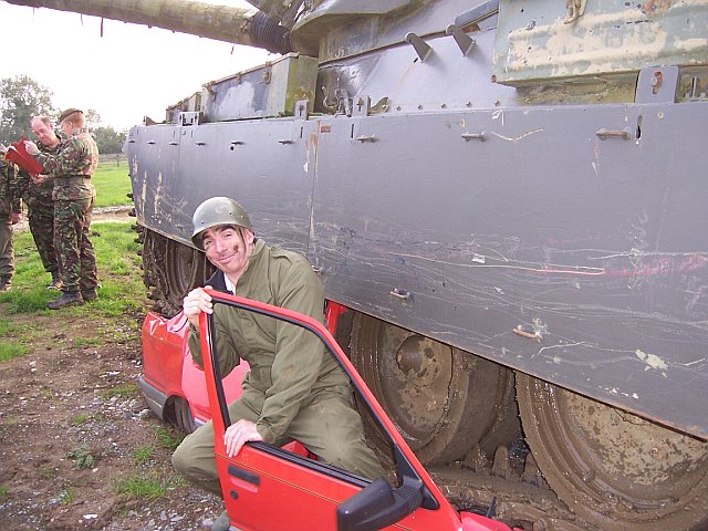 Glamour Girl Shoot - 16th Oct 2006 Despite the excitement of it being my birthday this was also the tank day that clashed with a nude glamour girl film shoot,If ever my tankie instructors were ever to know the difference between guys and girls this had to be the day .We had a mix of tank drivers, young and old, guys and girls .At the very last moment the girlie shoot was cancelled due to some pathetic reason ,nature of the industry apparently .I knew my guys wouldn't mind ,but what about SAS Colin? He's like a Gerka, once he's drawn his Karaki it has to draw blood,” Not a problem I'm into mature intellectual l birds at the moment” he said !. Was this just a dream? During the safety briefing I broke the bad news to the two stag parties that the the girls weren't coming but as way of consolation I would add the armoury lecture as a extra, did they care? ,Not a bit .which only goes to show guns rate above girls with the average male in the UK Now my chaps already k! new this and if you add a few tanks it's like a day in heaven The crush was done by one of the grooms not that on this occasion he had the highest score luckily he brought along an expert who gifted his crush to him, I thought that’s friendship! I heard later it was on condition that he came along on the Honeymoon! Sounds fair to me and the chaps. |
