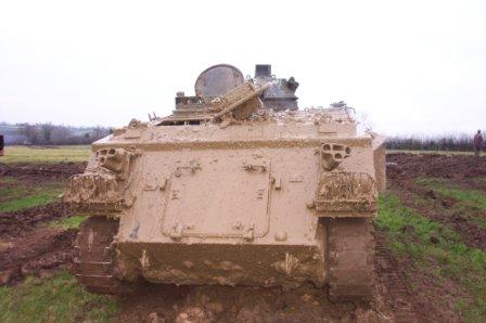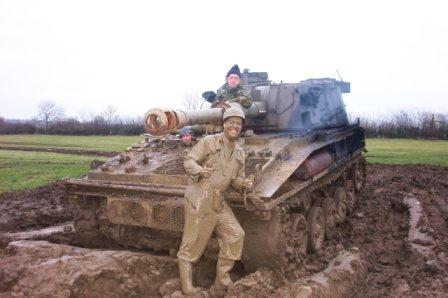 The Mud Man...... The mud man, on a full Monty we often get a little mud some times a lot. On this particular day we had a reasonable water splash that had turned to porridge Nigel the local landlord of the red lion was on his birthday full Monty day. His girlfriend whispered in my ear could we get him a bit muddy, always keen to oblige i had a word with the loader instructor i asked if he could arrange a touch extra speed so a small amount of slop came over the top of the drivers hatch on to Nigel’s thighs who in turn had a word with the driving instructor. God knows what he said all we heard was Drive, Drive Power, Power as the instructor disappeared down the commanders cupola closing the hatch behind him .The rest is history Nigel took it well if i could have seen his face i think it was smiling. His girlfriend Dawn nearly died laughing another reason to always have a paramedic on site. As for the vehicle guess who had the cleaning job |