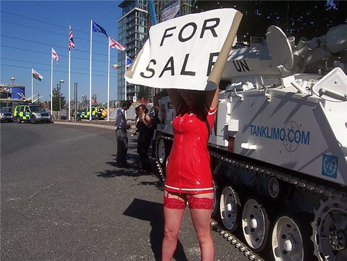 Here at Tank-alot we had a dream which could have become a nightmare. I'm often asked to do crazy things around London in tank's, we usually use our pink Abbott "Shown here" she's a beauty, really makes a splash, paparazzi love it not to mention Japanese tourists, serious happy snappers. But the Abbot doesn't lend its self well for passengers. So at Christmas we pulled out the best armored personnel carrier from 30 we had laying around. A bit of a special not only fitted with a turret for when it was on the Berlin wall, and one of only 13 ever made but she also had some strange mine laying or clearing gismo on its rear which we binned. We decided on Gloss white as you would. Chopped a few windows in the side fitted smoked glass Fridge; twin DVD's reversing cameras completely re trimmed the interior. We found the army had left the massive diesel powered crew heater in one of the 432,s so we threw that in as well. |